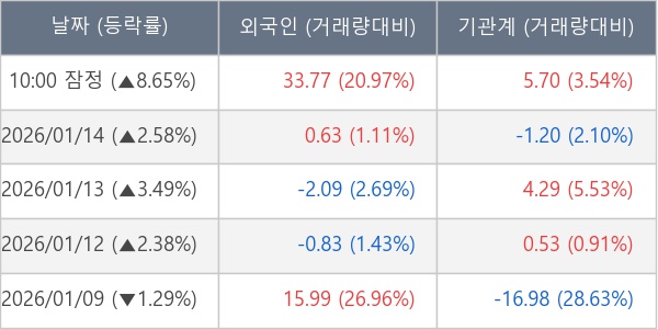 [서울=뉴스핌] 로보뉴스 = 15일 10시 15분 현재 대덕전자(353200)는 외국인과 기관이 각각 33.77 만 주, 5.70 만 주 순매수(잠정) 하면서 전일 대비 8.65% (현재가 49,600원) 상승하고 있다.