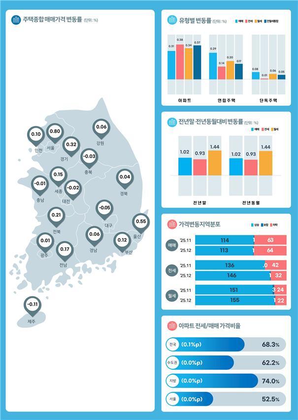 15일 한국부동산원의 2025년 12월 전국주택가격동향조사 결과, 전국 매매가격지수는 0.26% 상승한 가운데 수도권(0.46%), 서울(0.80%), 지방(0.07%) 각각 상승했다. 전세가격지수는 전국(0.28%), 수도권(0.42%), 서울(0.53%), 지방(0.15%)은 상승했으며 월세가격지수는 전국(0.27%), 수도권(0.39%), 서울(0.52%), 지방(0.16%)은 상승을 나타냈다.