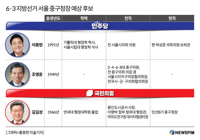[서울=뉴스핌] 이경화 기자 = 6·3 지방선거를 약 5개월 앞두고 서울 중구청장 선거 출마예정자의 윤곽이 차츰 드러나고 있다. 중구는 대선·총선·지선 등 최근 선거에서 보수 득표가 더 유리한 편으로 분석된다. 다만 동(洞)별로 대학가 등은 진보가 강세를 보이는 등 격전이 존재한다.