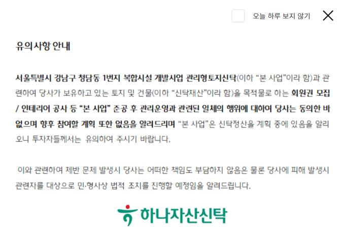 하나자산신탁은 앞선 공지를 통해 신탁 정산을 계획 중이라며, 신탁사의 동의 없는 회원 모집 행위로 발생할 수 있는 제반 문제에 대해 민·형사상 법적 조치를 예고했다.
