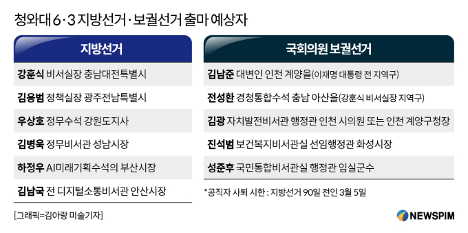 강훈식 비서실장의 출마도 여부도 주목된다. 충남 아산 3선 의원 출신인 강 실장은 이 대통령이 행정통합 속도전을 주문한 충남대전특별시 출마가 언급된다. 김용범 정책실장의 광주전남특별시 출마설도 나온다.