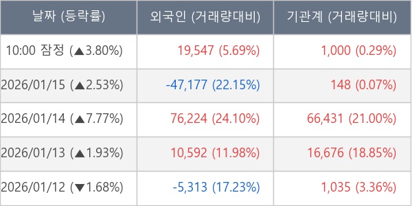 [장중수급포착] 한국가구, 기관 6일 연속 순매수행진... 주가 +3.80%
