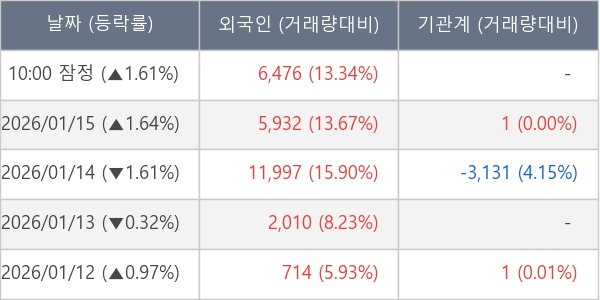 [서울=뉴스핌] 로보뉴스 = 16일 10시 15분 현재 성우테크론(045300)은 전일 대비 1.61% (현재가 3,150원) 상승했고, 외국인이 최근 7일 연속 순매수(누적 34,187주, 잠정) 행진을 하고 있다.