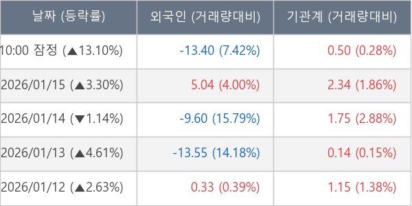 [장중수급포착] 클로봇, 기관 5일 연속 순매수행진... 주가 +13.10%