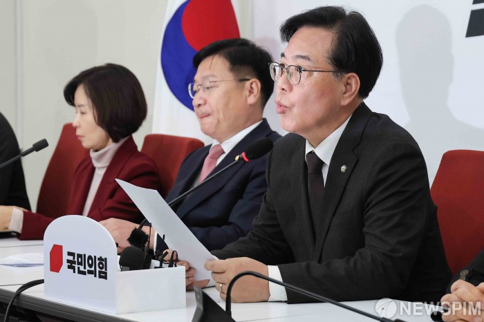 [서울=뉴스핌] 윤창빈 기자 = 송언석 국민의힘 원내대표가 16일 서울 여의도 국회에서 현안 관련 기자간담회를 하고 있다. 2026.01.16 pangbin@newspim.com