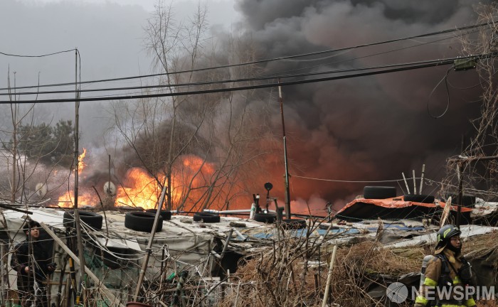 [서울=뉴스핌] 양윤모 기자 = 16일 오전 5시경 서울 강남구 개포동 구룡마을 4구역에서 화재가 발생해 주민들이 이동하고 있다. 소방당국은 대응 1단계를 2단계로 격상하고 추가 인력을 투입 진화를 완료했다. 2026.01.16 yym58@newspim.com