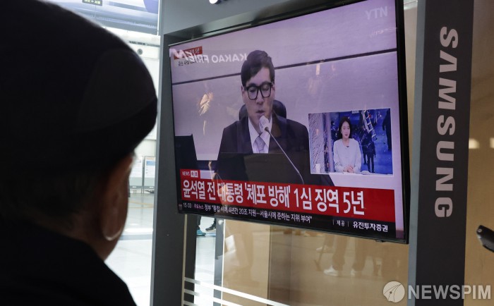 [서울=뉴스핌] 양윤모 기자 = 16일 오후 특수공무집행방해, 직권남용 권리행사방해 등 혐의로 기소된 윤석열 전 대통령에게 서울중앙지법 형사합의35부(백대현 부장판사)가 1심에서 징역 5년을 선고한 가운데, 서울역 대합실을 찾은 시민들이 관련 뉴스를 시청하고 있다. 2026.01.16 yym58@newspim.com