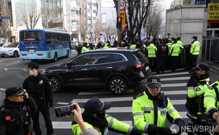 [서울=뉴스핌] 정일구 기자 = 윤석열 전 대통령의 체포방해 등 혐의 사건에 대한 1심 선고기일인 16일 오후 서울 서초구 서울중앙지방법원에서 윤 전 대통령이 탄 것으로 추정되는 호송차량이 법원을 나서고 있다. 서울중앙지법 형사합의35부(부장판사 백대현)는 이날 특수공무집행방해 등의 혐의로 기소된 윤 전 대통령에게 징역 5년을 선고했다. 2026.01.16 mironj19@newspim.com