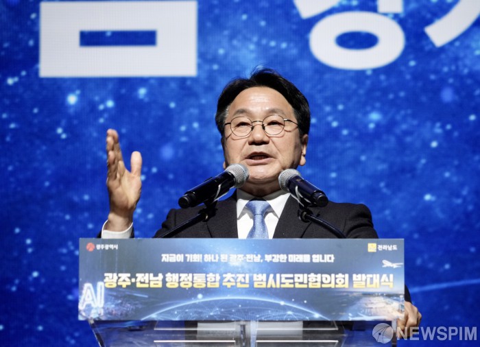 [광주=뉴스핌] 박진형 기자 = 강기정 광주시장이 16일 김대중컨벤션센터에서 열린 광주‧전남 행정통합 추진 범시도민 협의회 발대식에 참석해 행정통합 특별법안의 내용을 설명하고 있다. [사진=광주시] 2026.01.16 bless4ya@newspim.com