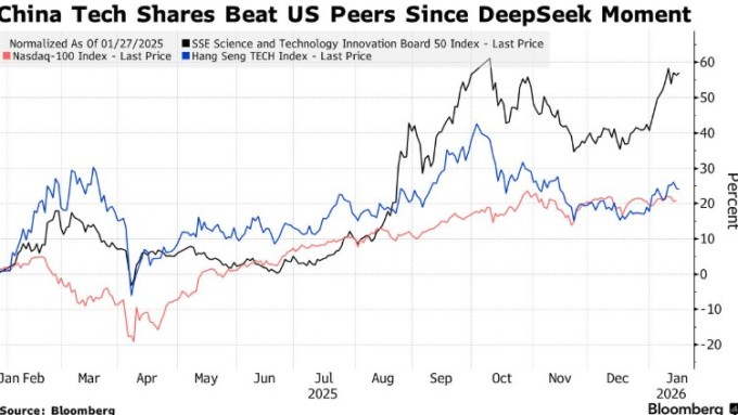 자국 기술에 대한 열광은 지난 4월 이후 중국 주식 강세장의 가장 큰 단일 동력이었으며, 이는 세계 2위 경제 대국이 주택 침체와 빈약한 소비에 빠져 있는 상황에서도 이어졌다. 이러한 모멘텀은 앞으로 몇 달 동안 딥시크가 새로운 AI 모델을 출시하고 중국이 기술 자립을 우선시하는 5개년 경제 청사진을 공개하면서 추가 지원을 받을 수 있다.
