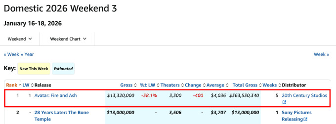 영화 '아바타: 불과 재'가 16일부터 19일 3일간 북미 박스오피스 1위에 오르며 5주 연속 1위를 차지하는 쾌거를 이뤘다.