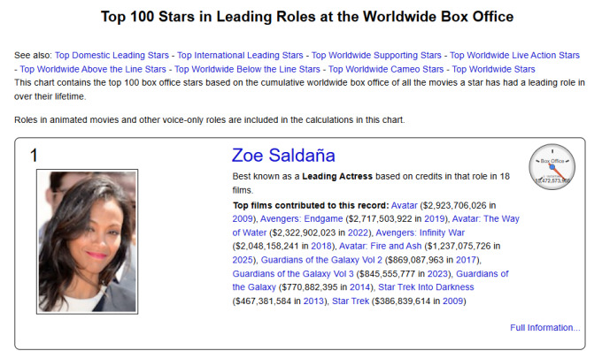 또 '아바타' 시리즈에서 '네이티리' 역을 연기하며 강렬한 액션과 가슴을 울리는 감정 연기를 선보인 조 샐다나가 역대 최고 흥행 수익을 달성한 배우로 기록됐다. 조 샐다나는 이번 '아바타: 불과 재'의 흥행과 함께 총 154억 7000만 달러(한화 약 22조 7904억 400만 원)의 수익을 올리며 스칼렛 요한슨을 뛰어넘고 1위에 올랐다.