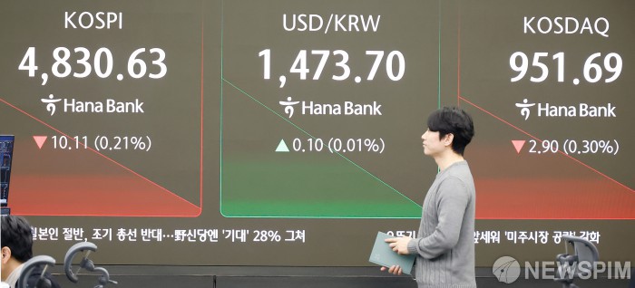 [서울=뉴스핌] 류기찬 기자 = 19일 오전 서울 중구 하나은행 딜링룸 전광판에 코스피, 달러/원, 코스닥 지수가 표시되고 있다. 이날 코스피 지수는 전 거래일 대비 11.34포인트(0.23%) 하락한 4829.40, 달러/원 환율은 0.4원 오른 1474.00원에, 코스닥 지수는 1.66포인트(0.17%) 내린 952.93에 장을 시작했다. 2026.01.19 ryuchan0925@newspim.com