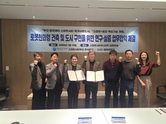 스마트시티부산㈜는 전날 경희대학교 인간중심 로봇친화 건축 연구단과 '로봇친화형 스마트시티 구현을 위한 업무협약(MOU)'을 체결했다고 20일 밝혔다. 이번 협약은 부산 에코델타 스마트시티 국가시범도시에 로봇 기반의 도시공간 모델을 적용하기 위한 전략적 협력이다.