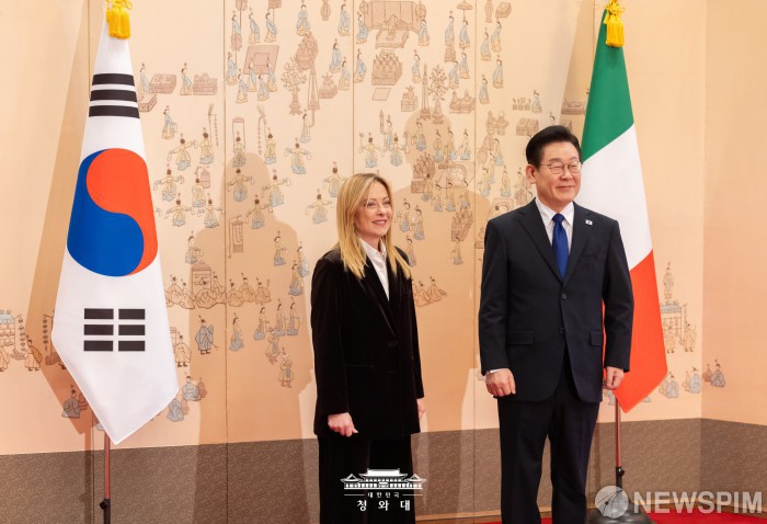 [서울=뉴스핌] 이재명 대통령이 지난 19일 서울 청와대에서 조르자 멜로니 이탈리아 총리와 정상회담을 앞두고 기념촬영을 하고 있다. [사진=청와대] 2026.01.20 photo@newspim.com