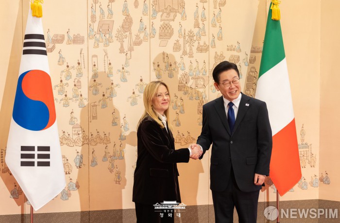 [서울=뉴스핌] 이재명 대통령이 지난 19일 서울 청와대에서 조르자 멜로니 이탈리아 총리와 정상회담을 앞두고 악수를 하고 있다. [사진=청와대] 2026.01.20 photo@newspim.com
