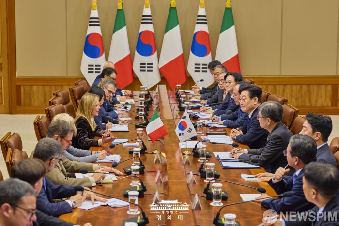 [서울=뉴스핌] 이재명 대통령이 지난 19일 오전 청와대에서 조르자 멜로니 이탈리아 총리와 정상회담을 하고 있다. [사진=청와대] 2026.01.20 photo@newspim.com