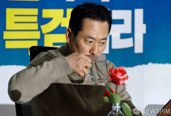 [서울=뉴스핌] 윤창빈 기자 = 통일교·공천헌금 '쌍특검'을 요구하며 엿새째 단식을 진행 중인 장동혁 국민의힘 대표가 20일 서울 여의도 국회 로텐더홀 농성장에서 물을 마시고 있다. 2026.01.20 pangbin@newspim.com