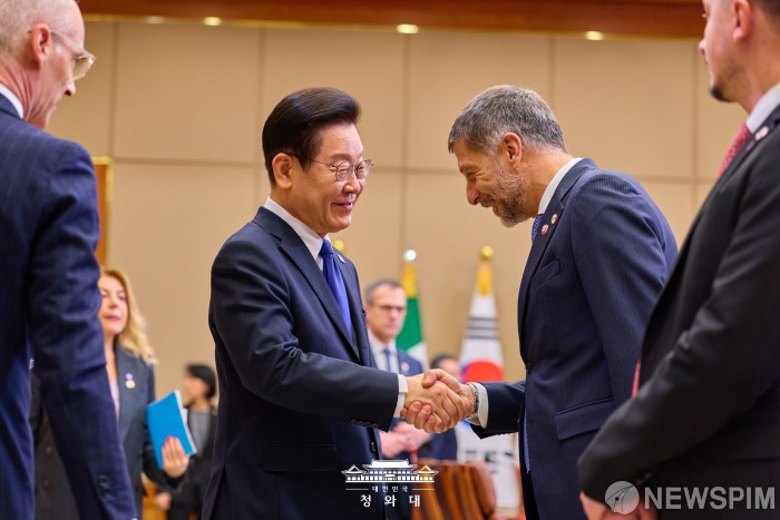 [서울=뉴스핌] 이재명 대통령이 지난 19일 오전 청와대에서 열린 한-이탈리아 정상회담을 앞두고 이탈리아 정부 관계자와 악수를 하고 있다. [사진=청와대] 2026.01.20 photo@newspim.com