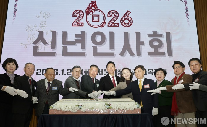 [서울=뉴스핌] 양윤모 기자 = 오세훈 서울시장이 20일 오전 서울시청 다목적홀에서 개최된 '2026년 대한노인회 서울연합회 신년인사회' 행사에서 참석자들과 축하 떡을 절단하고 있다. 행사에는 오세훈 서울시장,고광선 대한노인회 서울시연합회장,최호정 서울시의회 의장, 정근식 서울시 교육감등 300여명이 참석했다. 2026.01.20 yym58@newspim.com