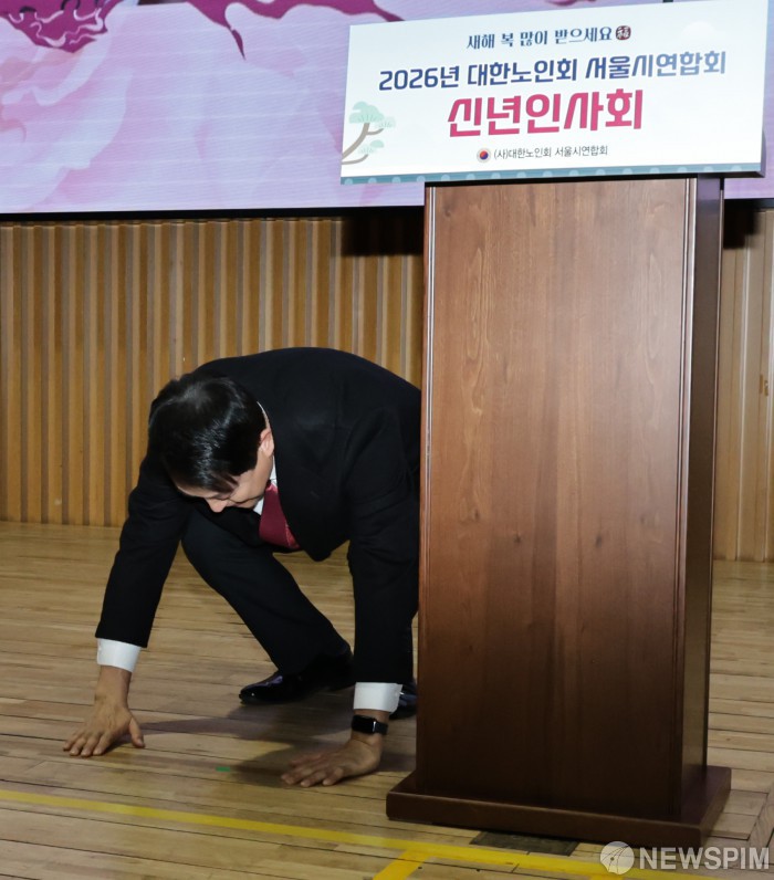 [서울=뉴스핌] 양윤모 기자 = 오세훈 서울시장이 20일 오전 서울시청 다목적홀에서 개최된 '2026년 대한노인회 서울연합회 신년인사회' 행사에 참석해 큰절을 하고 있다. 행사에는 오세훈 서울시장,고광선 대한노인회 서울시연합회장,최호정 서울시의회 의장, 정근식 서울시 교육감등 300여명이 참석했다. 2026.01.20 yym58@newspim.com