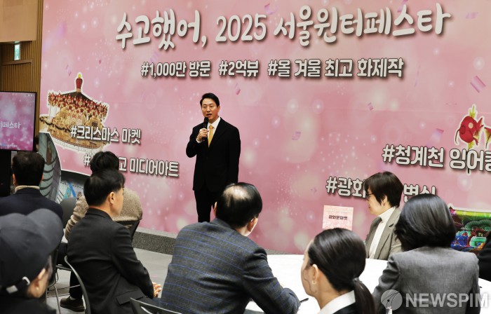 [서울=뉴스핌] 양윤모 기자 = 오세훈 서울시장이 20일 '2025 서울윈터페스타'의 운영 성과를 공유하기 위한 간담회 '수고했어, 2025 서울윈터페스타'에서 참석해 인사말을 하고 있다. 이날 행사에는 오세훈 서울시장을 비롯해 윈터페스타에 참여한 기관 관계자, 축제 감독, 행사 참여 시민 등 50여명이 참석했다. 2026.01.20 yym58@newspim.com
