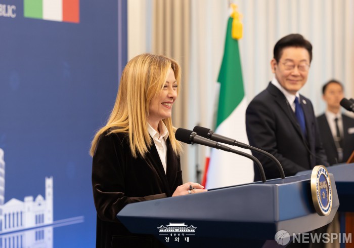 [서울=뉴스핌] 조르자 멜로니 이탈리아 총리가 지난 19일 청와대에서 이재명 대통령과 정상회담을 마치고 공동 언론발표를 하고 있다. [사진=청와대] 2026.01.20 photo@newspim.com