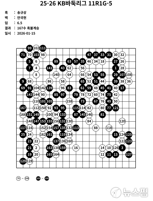 울산 고려아연은 15∼18일 열린 2025-2026 KB국민은행 바둑리그 11라운드에서 정관장을 상대로 2국까지 내주며 끌려가던 상황을 송규상 등의 활약으로 3-2 역전승을 거뒀다. 전반기 맞대결에 이어 다시 한번 3-2 승리를 챙긴 울산 고려아연은 8연승을 기록하며 선두에 올랐고, 정관장은 최하위에 머물렀다.