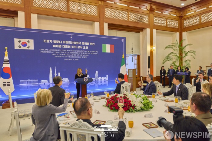 [서울=뉴스핌] 조르자 멜로니 이탈리아 총리가 지난 19일 청와대에서 이재명 대통령과 정상회담을 마치고 열린 공식 오찬에서 건배사를 하고 있다. [사진=청와대] 2026.01.20 photo@newspim.com