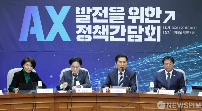 [서울=뉴스핌] 윤창빈 기자 = 정청래 더불어민주당 대표가 20일 서울 여의도 국회에서 열린 AX 발전을 위한 정책간담회에서 모두발언을 하고 있다. 2026.01.20 pangbin@newspim.com