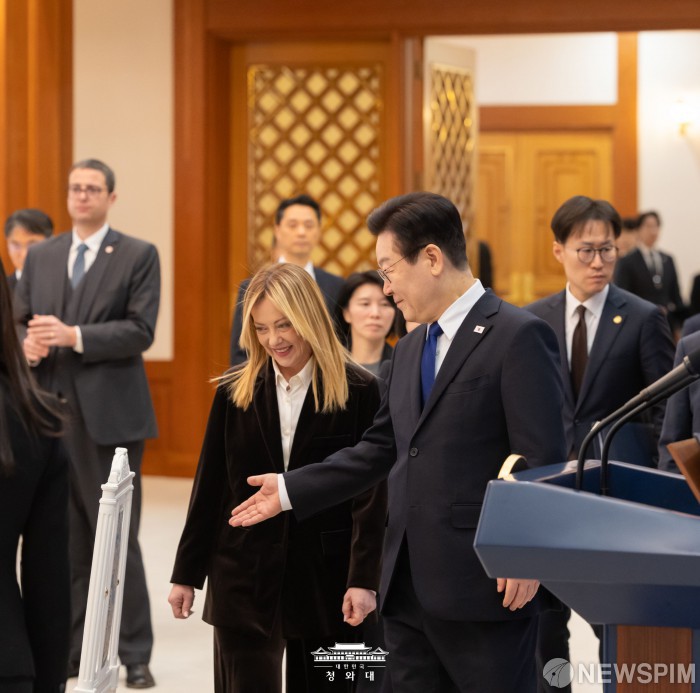[서울=뉴스핌] 이재명 대통령이 지난 19일 청와대에서 조르자 멜로니 이탈리아 총리와 오찬을 위해 이동하고 있다. [사진=청와대] 2026.01.20 photo@newspim.com