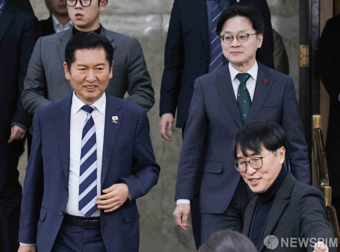 [서울=뉴스핌] 윤창빈 기자 = 정청래 더불어민주당 대표, 김정관 산업통상부 장관이 20일 서울 여의도 국회에서 열린 AX 발전을 위한 정책간담회에 참석하고 있다. 2026.01.20 pangbin@newspim.com
