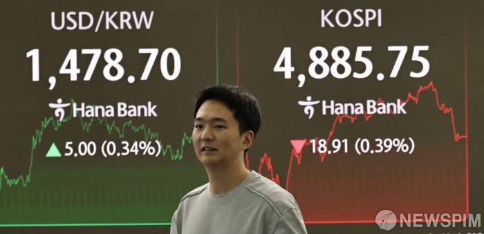 [서울=뉴스핌] 양윤모 기자 = 20일 오후 코스피가 전장 종가보다 18.91 포인트(0.39%) 하락하며 4885.75로, 코스닥은 8.01 포인트(0.83%) 상승한 976.37로 장을 마감한 가운데, 서울 중구 하나은행본점 딜링룸에서 직원들이 업무를 보고 있다. 서울외환시장에서 달러/원 환율은 전장 대비 5.00원 상승한 1478.70원에 주간거래를 마감했다. 2026.01.20 yym58@newspim.com