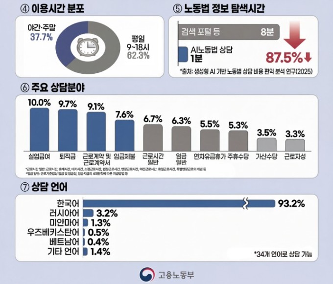 지난해 노동부가 권순원 숙명여대 교수와 진행한 '생성형 AI 기반 노동법 상담 비용·편익 분석 연구'에 따르면 검색 포털 등을 활용한 정보 탐색 시간은 8분이었으나, AI 상담에서는 1분으로 줄면서 87.5% 줄어든 것으로 나타났다.