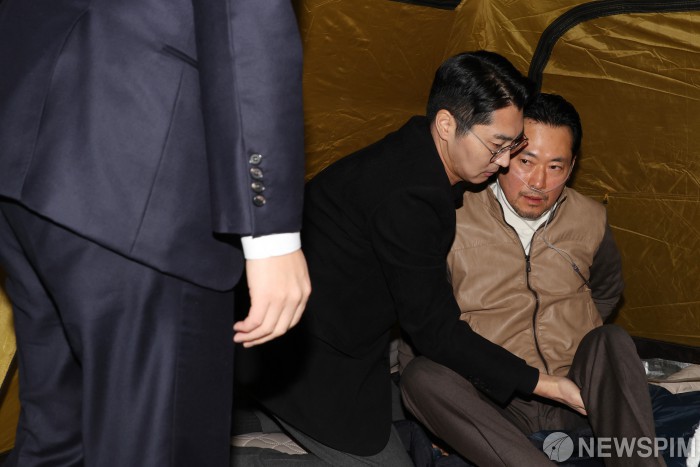 [서울=뉴스핌] 정일구 기자 = 통일교·공천헌금 '쌍특검' 수용을 촉구하며 단식 7일 차를 맞은 장동혁 국민의힘 대표가 21일 오전 서울 여의도 국회 로텐더홀 단식 농성장에서 박준태 당 대표 비서실장의 부축을 받으며 이준석 개혁신당 대표를 맞이하고 있다. 2026.01.21 mironj19@newspim.com