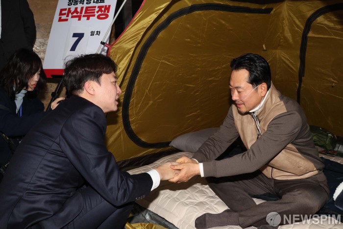 [서울=뉴스핌] 정일구 기자 = 통일교·공천헌금 '쌍특검' 수용을 촉구하며 단식 7일 차를 맞은 장동혁 국민의힘 대표가 21일 오전 서울 여의도 국회 로텐더홀 단식 농성장을 찾은 이준석 개혁신당 대표와 인사하고 있다. 2026.01.21 mironj19@newspim.com