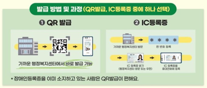 모바일 장애인등록증을 발급받고자 하는 장애인은 신분증과 본인 명의의 스마트폰을 가지고 가까운 행정복지센터에 방문하면 된다. 지방자치단체 담당자가 출력하는 큐알(QR)코드를 촬영해 신청 당일에 발급을 마칠 수 있다. 이후 IC 칩이 내장된 장애인등록증을 새로 신청하고 IC 등록증을 수령한 이후 IC 등록증을 스마트폰에 접촉하면 된다.