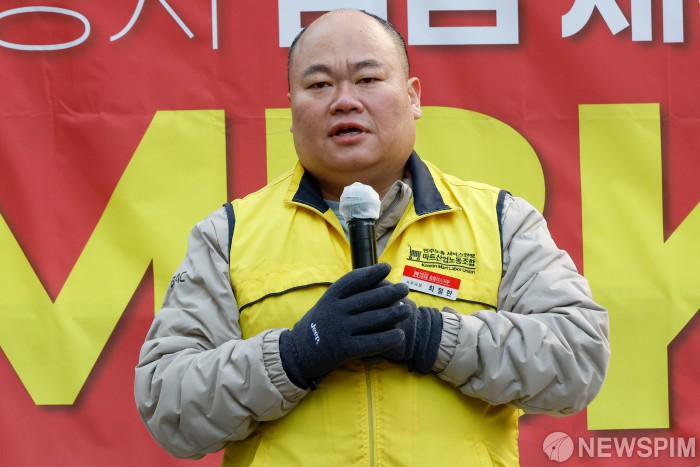 [서울=뉴스핌] 류기찬 기자 = 최철한 민주노총 서비스연맹 마트산업노조 홈플러스지부 사무국장이 21일 오전 서울 종로구 MBK 파트너스 사무실 앞에서 열린 ‘MBK규탄 마트노조 홈플러스지부 간부 결의대회’에서 발언을 하고 있다. 2026.01.21 ryuchan0925@newspim.com