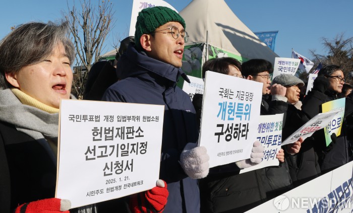 [서울=뉴스핌] 이형석 기자 = 시민주도 헌법개정 전국 네트워크가 21일 오전 서울 여의도 국회 앞에서 '11년째 직무유기, 국민투표법 개정 않는 국회 규탄한다!' 신년기자회견을 열고 구호를 외치고 있다. 2026.01.21 leehs@newspim.com