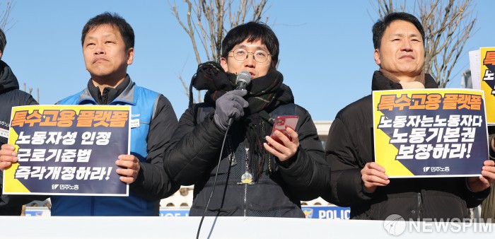 [서울=뉴스핌] 이형석 기자 = 전국민주노동조합총연맹이 21일 오전 서울 여의도 국회 앞에서 ‘근로기준법 개정으로 특수고용·플랫폼 노동자 노동기본권 보장하라!’ 기자회견을 열고 있다. 2026.01.21 leehs@newspim.com