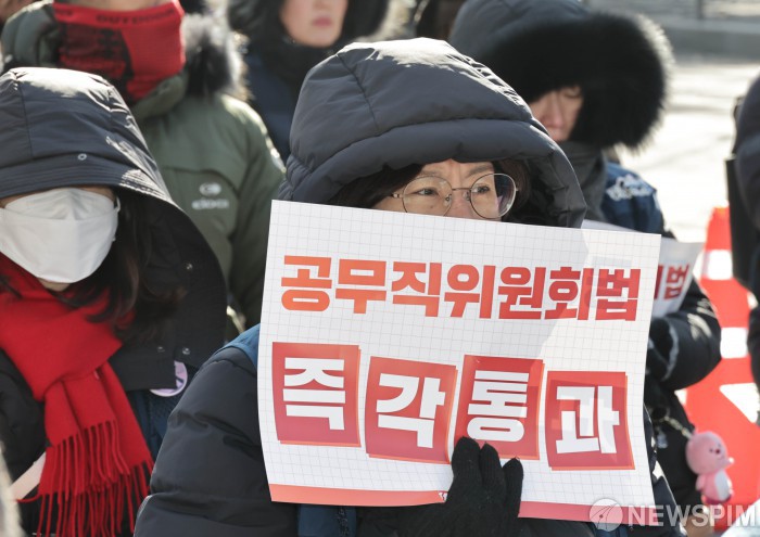 [서울=뉴스핌] 양윤모 기자 = 비정규직 차별 해소, 실질임금 인상, 공공성 강화 등을 요구하는 '민주노총 공공부문 비정규직노동자 결의대회'가 21일 오후 서울 종로구 청와대 사랑채옆에서 개최 되었다. 2026.01.21 yym58@newspim.com