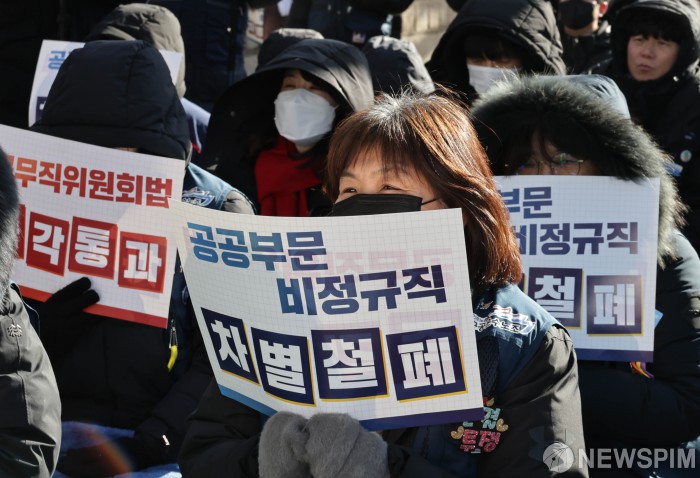 [서울=뉴스핌] 양윤모 기자 = 비정규직 차별 해소, 실질임금 인상, 공공성 강화 등을 요구하는 '민주노총 공공부문 비정규직노동자 결의대회'가 21일 오후 서울 종로구 청와대 사랑채옆에서 개최 되었다. 2026.01.21 yym58@newspim.com