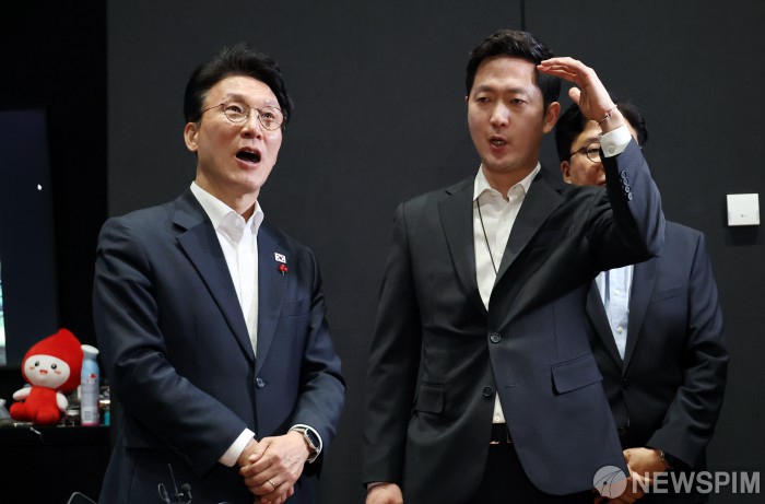 [서울=뉴스핌] 정일구 기자 = 김민석 국무총리가 21일 오후 서울 용산구 하이브 사옥 안무연습실을 방문해 이재상 하이브 대표이사의 설명을 듣고 있다. 2026.01.21 mironj19@newspim.com