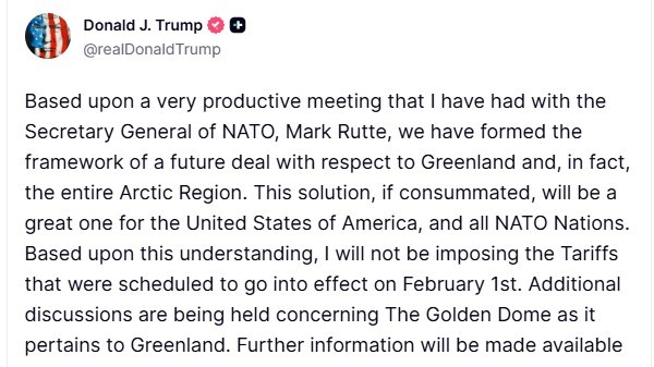 트럼프 대통령은 자신의 소셜미디어 트루스 소셜에 글을 올려 "마르크 뤼터 나토 사무총장과 매우 생산적인 회담을 가졌다"며 "그린란드 및 북극권 전역에 관한 미래 협상의 틀(Framework)을 마련했다"고 밝혔다. 그는 "이 해결책이 성사된다면 미국은 물론 모든 나토 회원국에도 훌륭한 결과가 될 것"이라며 "이러한 상호 이해를 바탕으로 2월 1일자로 예정됐던 관세 부과를 시행하지 않기로 했다"고 덧붙였다.