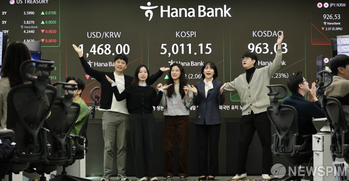 [서울=뉴스핌] 양윤모 기자 = 22일 오전 코스피가 5000 을 돌파하자 서울 중구 하나은행본점 딜링룸에서 직원들이 환호하고 있다. 2026.01.22 yym58@newspim.com