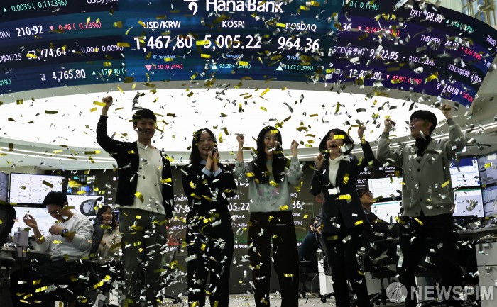 [서울=뉴스핌] 양윤모 기자 = 22일 오전 코스피가 5000 을 돌파하자 서울 중구 하나은행본점 딜링룸에서 직원들이 환호하고 있다. 한편 이재명 대통령은 더불어민주당 '코스피 5,000 특별위원회' 소속 위원들을 청와대로 초청해 오찬을 함께한다. 2026.01.22 yym58@newspim.com