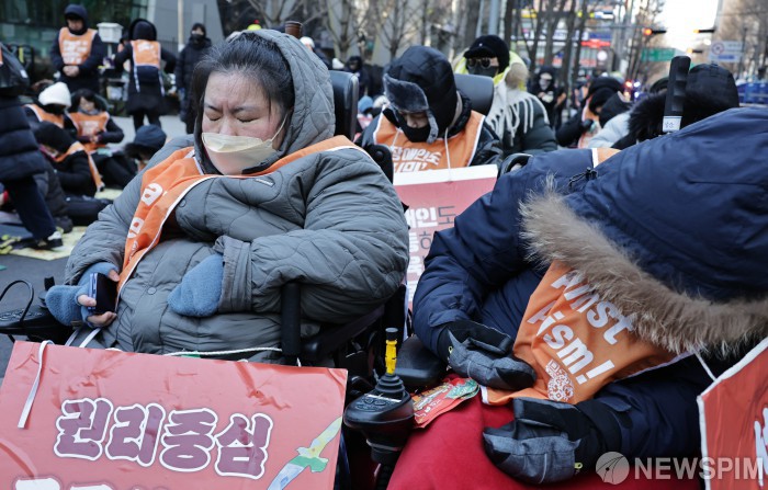 [서울=뉴스핌] 양윤모 기자 = 오이도역 리프트 추락참사 25주기를 맞아 전국장애인차별철폐연대와 민주노총이 22일 오전 '오세훈 서울시장 장애인권리약탈 STOP! 촉구 결의대회'를 서울시청 동편에서 개최 했다. 참석자들은 ‘약자와의 동행’이라는 구호 아래 감춰진 서울시의 기만적 행정을 폭로하며 오세훈 서울시장에 의해 하루 아침에 강행된 권리중심 최중증 장애인 맞춤형 공공일자리 폐지를 규탄했다. 2026.01.22 yym58@newspim.com