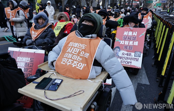 [서울=뉴스핌] 양윤모 기자 = 오이도역 리프트 추락참사 25주기를 맞아 전국장애인차별철폐연대와 민주노총이 22일 오전 '오세훈 서울시장 장애인권리약탈 STOP! 촉구 결의대회'를 서울시청 동편에서 개최 했다. 참석자들은 '약자와의 동행'이라는 구호 아래 감춰진 서울시의 기만적 행정을 폭로하며 오세훈 서울시장에 의해 하루 아침에 강행된 권리중심 최중증 장애인 맞춤형 공공일자리 폐지를 규탄했다. 2026.01.22 yym58@newspim.com