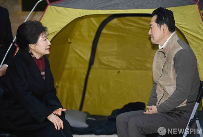 [서울=뉴스핌] 윤창빈 기자 = 박근혜 전 대통령이 22일 서울 여의도 국회 로텐더홀에서 통일교·공천헌금 '쌍특검' 수용을 요구하며 8일째 단식 중인 국민의힘 장동혁 대표를 찾아 대화하고 있다. 2026.01.22 pangbin@newspim.com