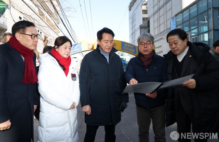 [서울=뉴스핌] 정일구 기자 = 용산전자상가 현장 점검에 나선 오세훈 서울시장이 22일 오전 서울 용산구 나진상가 일대에서 현장을 둘러보고 있다. 2026.01.22 mironj19@newspim.com